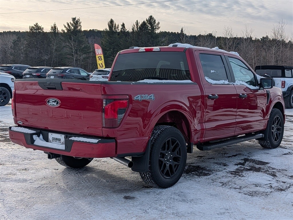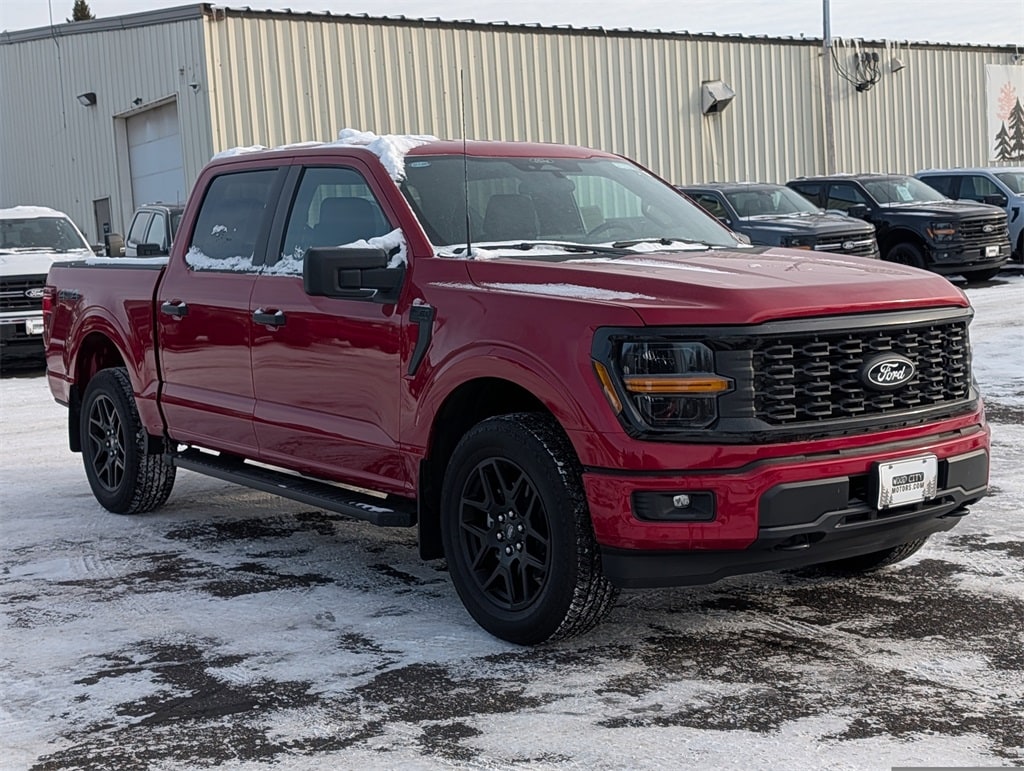 Rapid Red Metallic Tinted Clearcoat 2025 Ford F-150 STX 4WD 10-Speed Automatic 2.7L V6 EcoBoost 4WD, 20" Wheels, 3.55 Axle Ratio, 4-Wheel Disc Brakes, 400W Cab & Bed Outlets, 6 Speakers, 6" Black Running Boards, ABS brakes, Air Conditioning, Alloy wheels, AM/FM radio, Auto High-beam Headlights, Black Exterior Badging, Brake assist, Bumpers: body-color, Compass, Console Worksurface, Delay-off headlights, Driver door bin, Dual front impact airbags, Dual front side impact airbags, Electronic Locking w/3.55 Axle Ratio, Electronic Stability Control, Emergency communication system: SYNC 4 911 Assist, Engine Block Heater, Equipment Group 200A Mid, Front anti-roll bar, Front Bucket Seats, Front Center Armrest, Front License Plate Bracket, Front reading lights, Front wheel independent suspension, Fully automatic headlights, Gray Box Side Decal, GVWR: 6,650 lbs Payload Package, Heated door mirrors, Illuminated entry, LED Fog Lamps w/LED Cornering Lamp, Low tire pressure warning, Mobile Office Package, Occupant sensing airbag, Outside temperature display, Overhead airbag, Overhead console, Panic alarm, Passenger door bin, Passenger vanity mirror, Power door mirrors, Power steering, Power windows, Radio data system, Radio: AM/FM Stereo w/6 Speakers, Rear Parking Sensors, Rear step bumper, Rear window defroster, Remote keyless entry, Security system, Speed control, Split folding rear seat, Steering wheel mounted audio controls, STX Black Appearance Package, SYNC 4 w/Enhanced Voice Recognition, Tachometer, Telescoping steering wheel, Tilt steering wheel, Traction control, Trip computer, Unique Sport Cloth 40/Console/40 Front-Seats, Variably intermittent wipers, Voltmeter, Wheels: 18" Gloss Black, Wheels: 20" Dark Gray w/Machined Aluminum, Wheels: 20" Gloss Black, 4WD.
